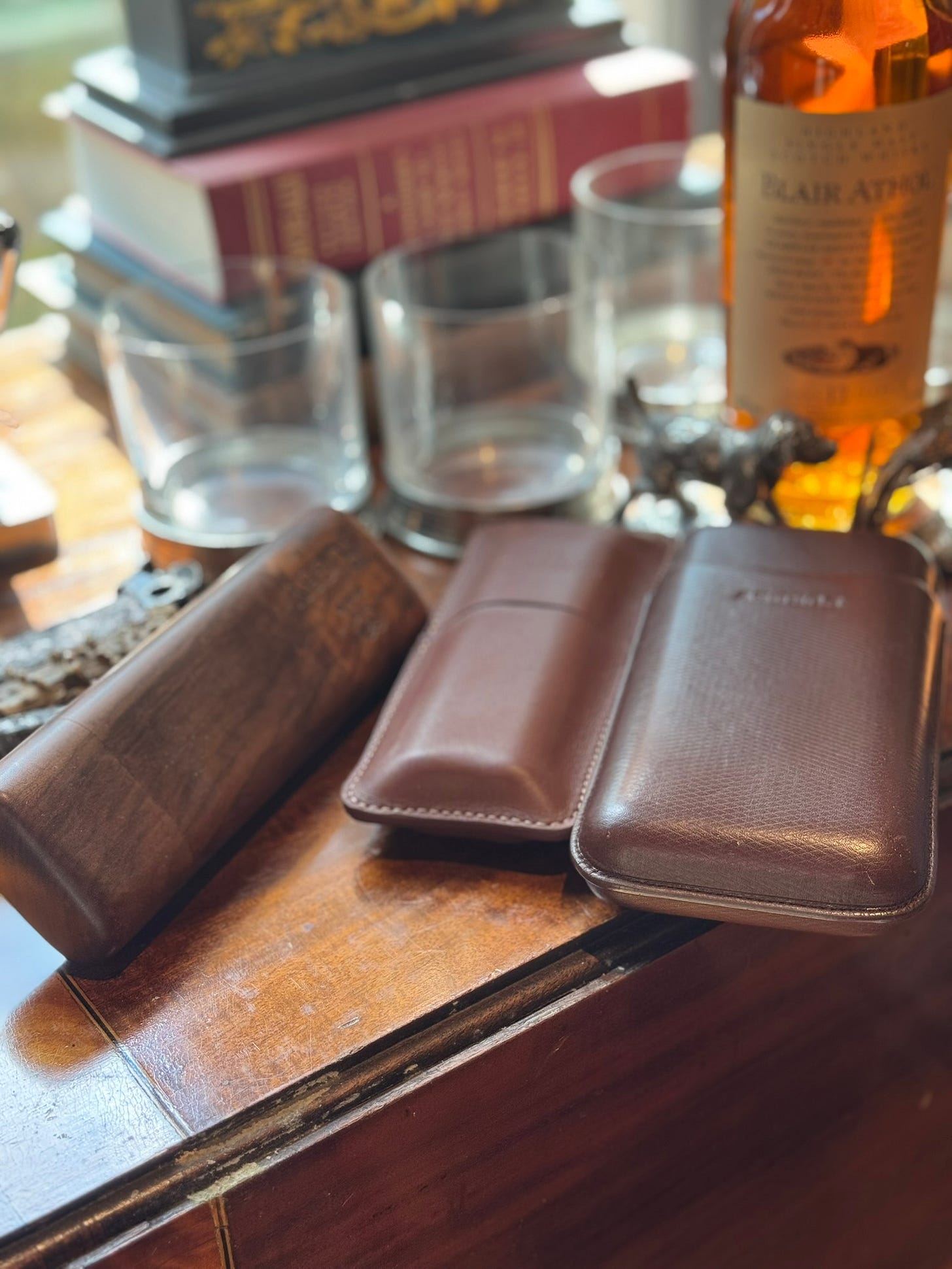 More often than not when I pack for a weekend trip, I always try to bring along a couple of cigars. I used to throw them in a zip lock bag and find a spot in my shaving kit or a side pocket of my Filson bag where they would be somewhat protected. This did not always work out as planned. I sometimes showed up to my destination with cigars in a less than pristine condition. I finally broke down and purchased a leather cigar holder from Purdey. Did I need a fine leather cigar holder from Purdey, no but I did need a cigar holder for travel.
